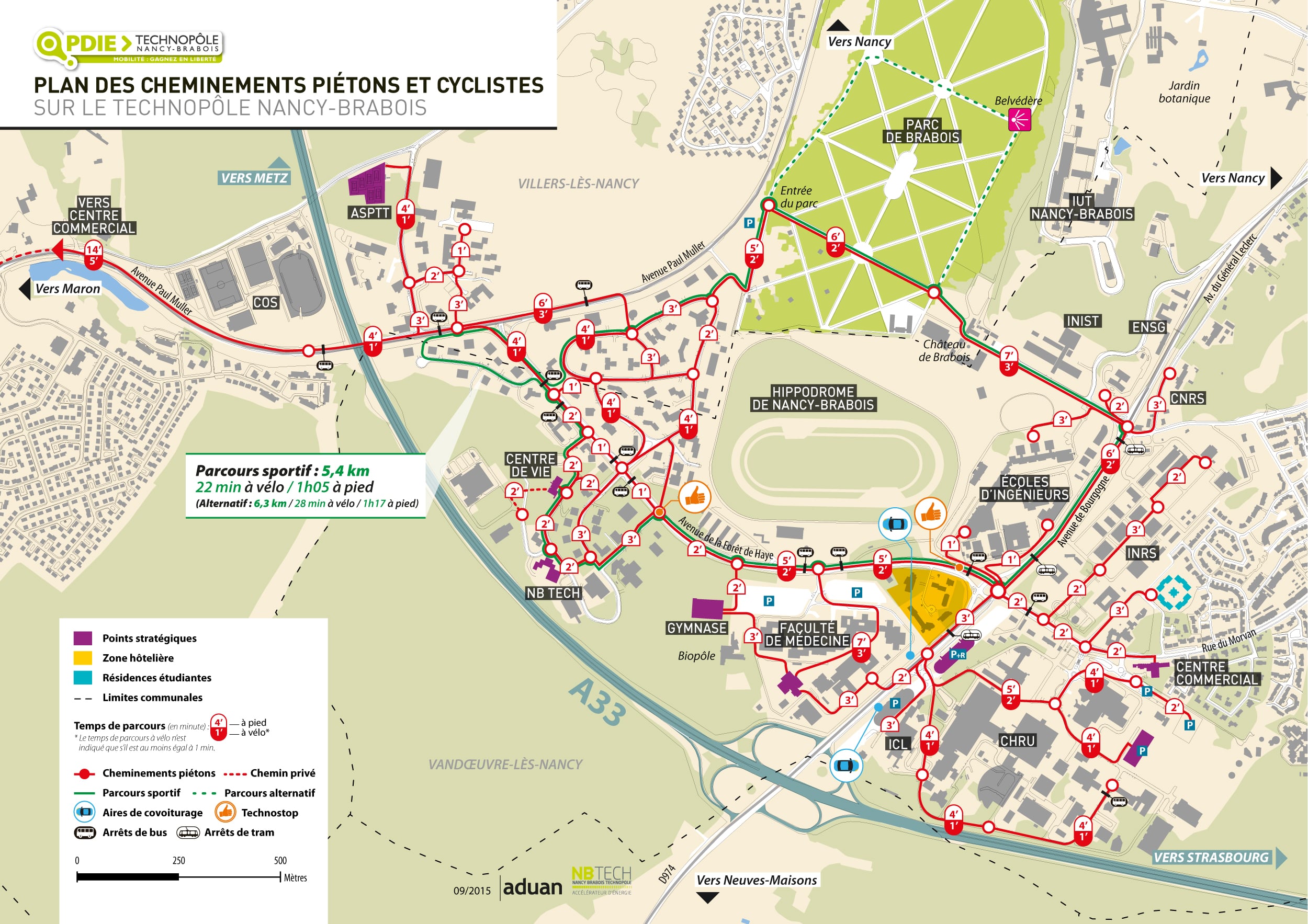 Ce plan a la particularité de donner les temps de trajets à pied et à vélo entre différents points sur l’ensemble des secteurs du Technopôle de Brabois (plateau)